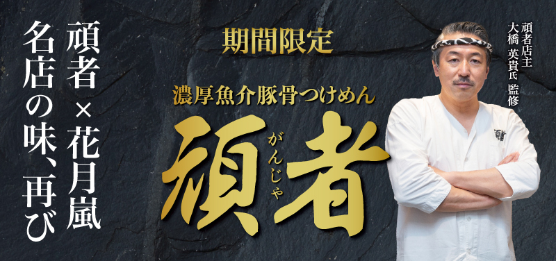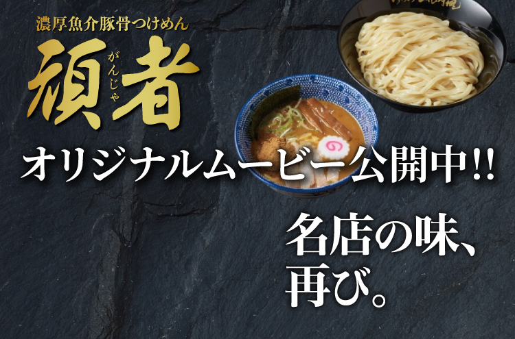 - チャーシュー3枚と半熟味玉が追加される特製トッピングもご用意。チャーシューがほどよい満足感をプラスし、とろりとした半熟味玉が、濃厚なつけダレにまろやかさとコクを与えます。頑者の味を、もう一歩深く楽しみたい方におすすめです。